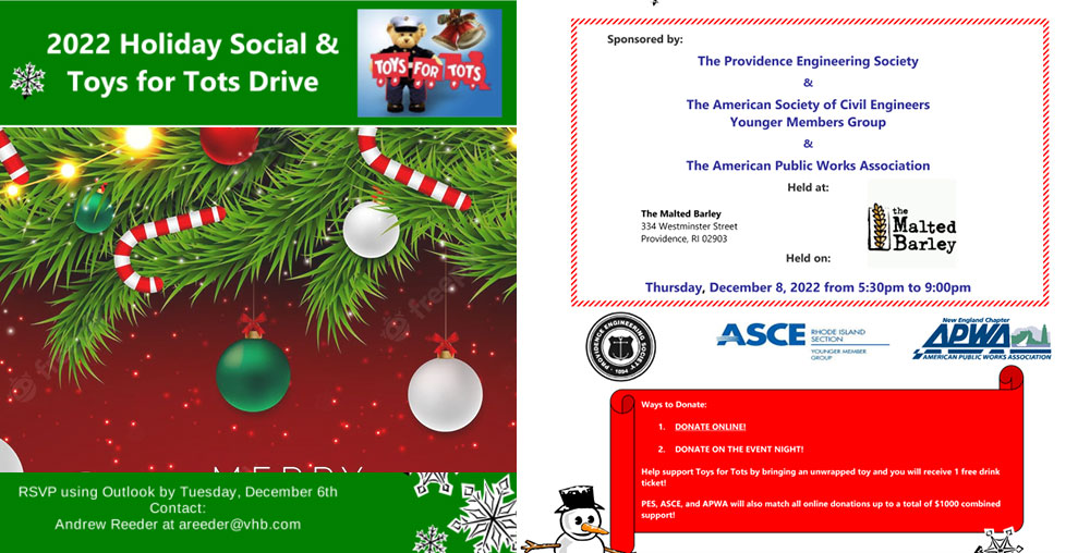 The ASCE/PES/APWA Holiday Social and Toys for Tots Drive at Malted Barley was a success! We had around 40 people from across ASCE, PES, and APWA in attendance. Here is the final breakdown for the event: 45 toys were collected These were dropped off at the North Smithfield Police Station Toys for Tots drop off location. They will be picked up on December 15th and distributed throughout the state. $545 in donations from attendees were made online to Toys for Tots. A $545 matching donation was made in the names ASCE, PES, and APWA. This brought the total level of support to Toys for Tots to $1090! I would also like to thank PES and APWA for helping plan this event and generating turnout. Frank Marinaccio and Danielle Goudreau were huge helps. “ASCE, PES, and APWA were happy to host last week’s 2022 Holiday Social and Toys for Tots Drive in Providence. Together, we collected 45 toys in addition to raising over $1000 in donations for Toys for Tots. Thank you to our members for turning out to support Toys for Tots and to The Malted Barley for helping coordinate this event.” Thank you everyone!