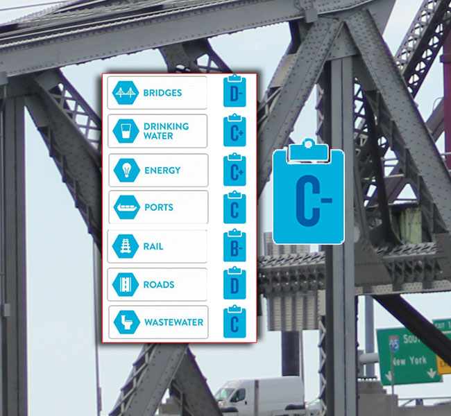 ASCE’s Infrastructure Report Card provides a comprehensive assessment of current infrastructure conditions and needs, assigning grades and making recommendations to raise them. The 2017 Report Card found the national grade for infrastructure to be a D+.